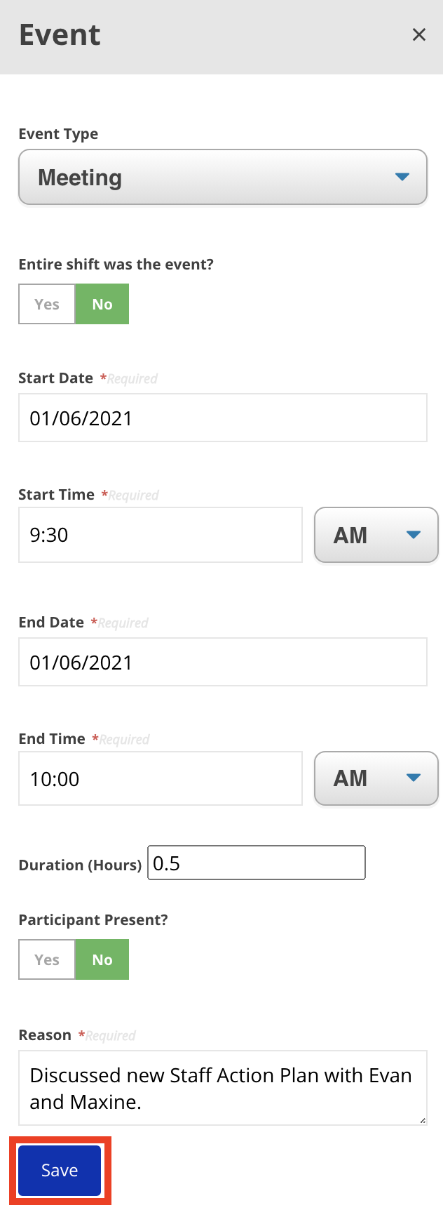 Events are explicitly recorded timeframes within a shift. Events within a shift must be recorded because they effect what can be billed to Medicaid. They can be added to shifts of most job and method types. There is no limit to the number of events that can be added to a shift. An event can also span a fraction of a shift or the entire shift, as might be the case with training.