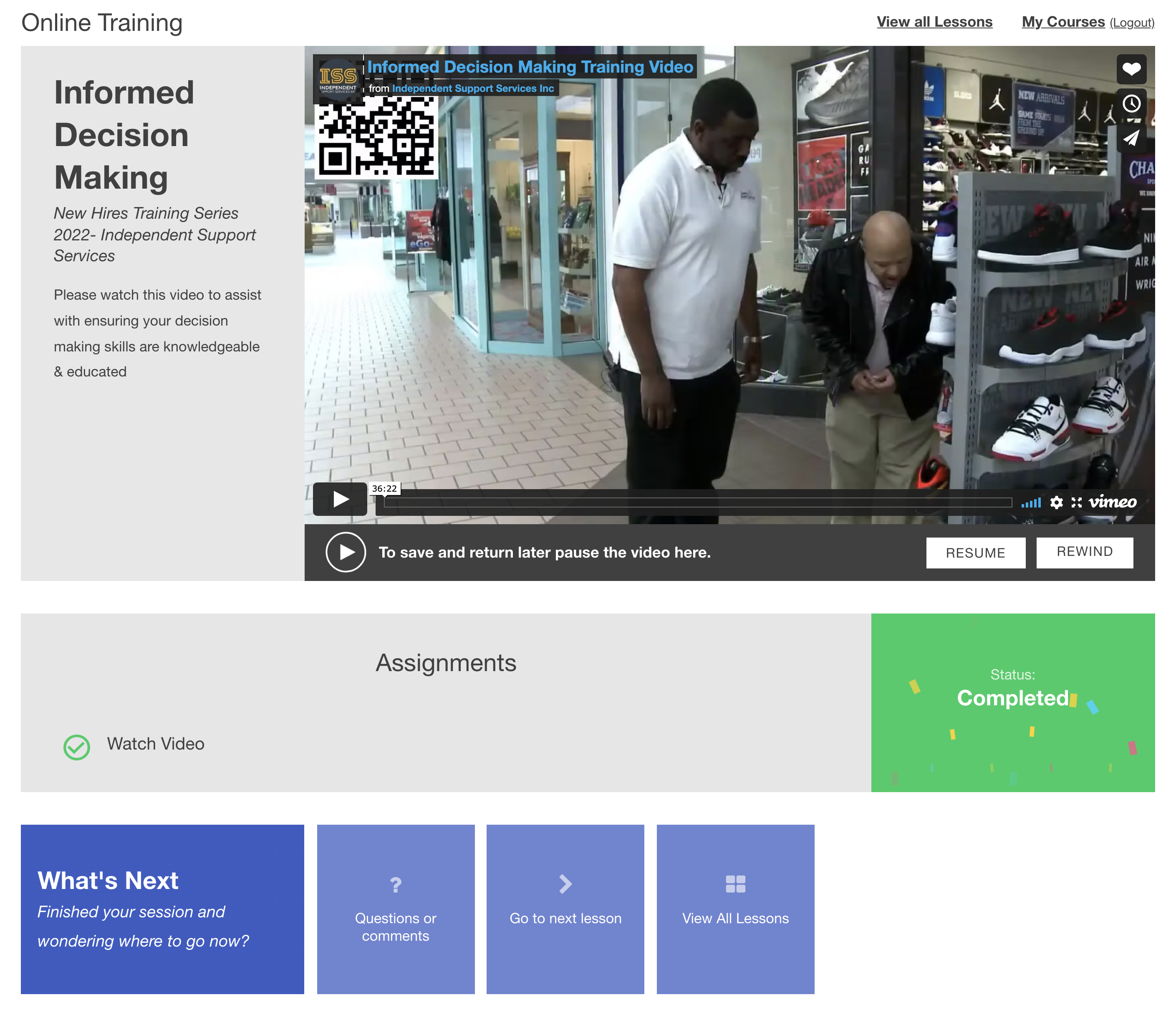 To begin a lesson, click the desired lesson widget and it will begin. The Learning Management System will remember progress that has been made on each lesson and will resume where left off.