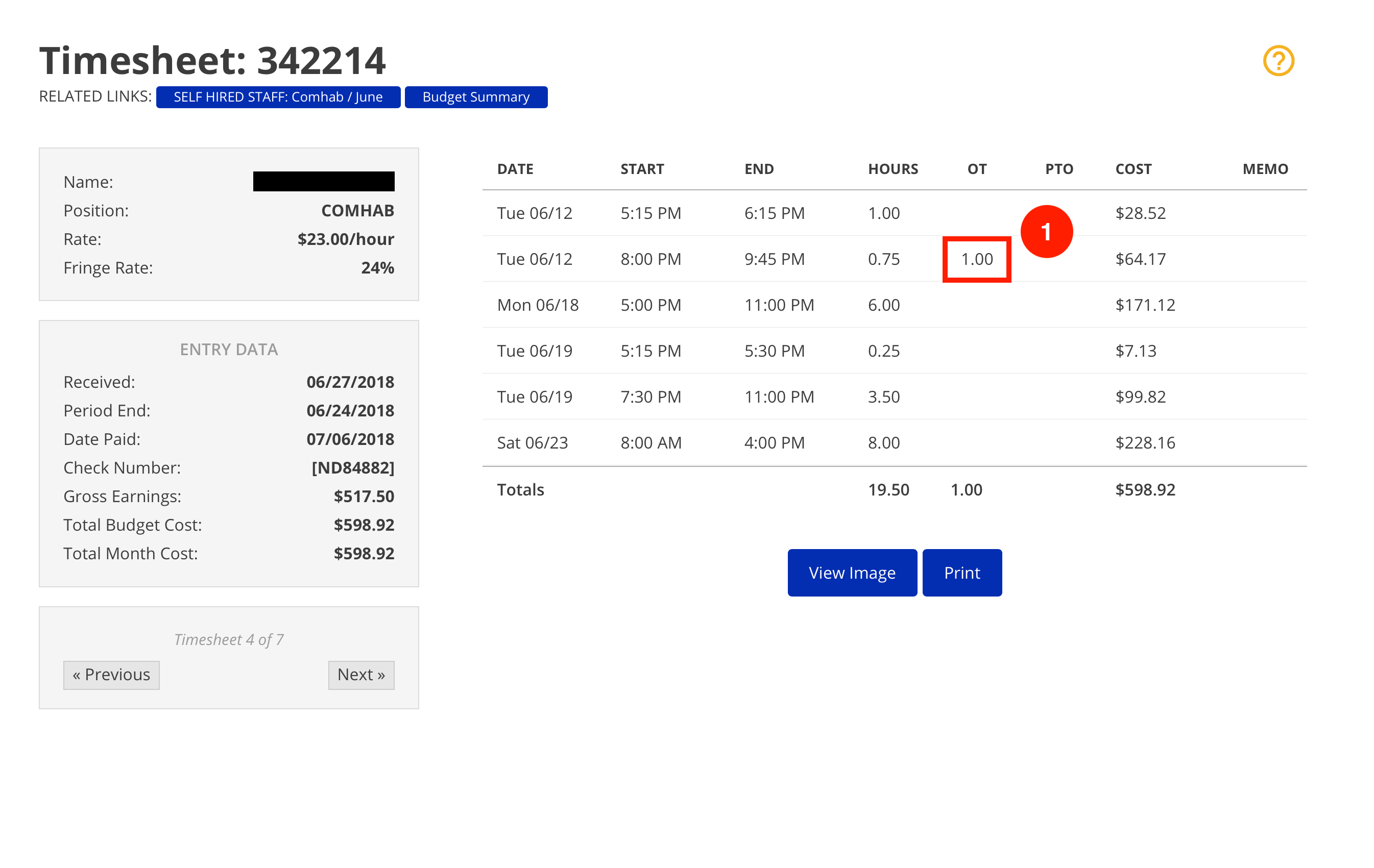 A timesheet containing OT can be identified only on the Item Detail view. A column titled "OT" will appear, with the number of OT hours listed for each line with OT.